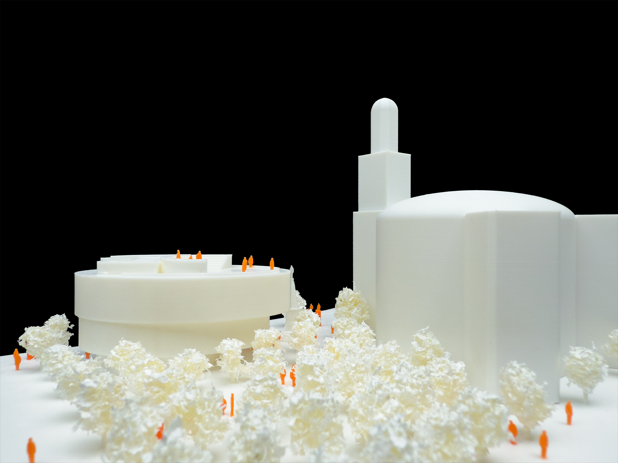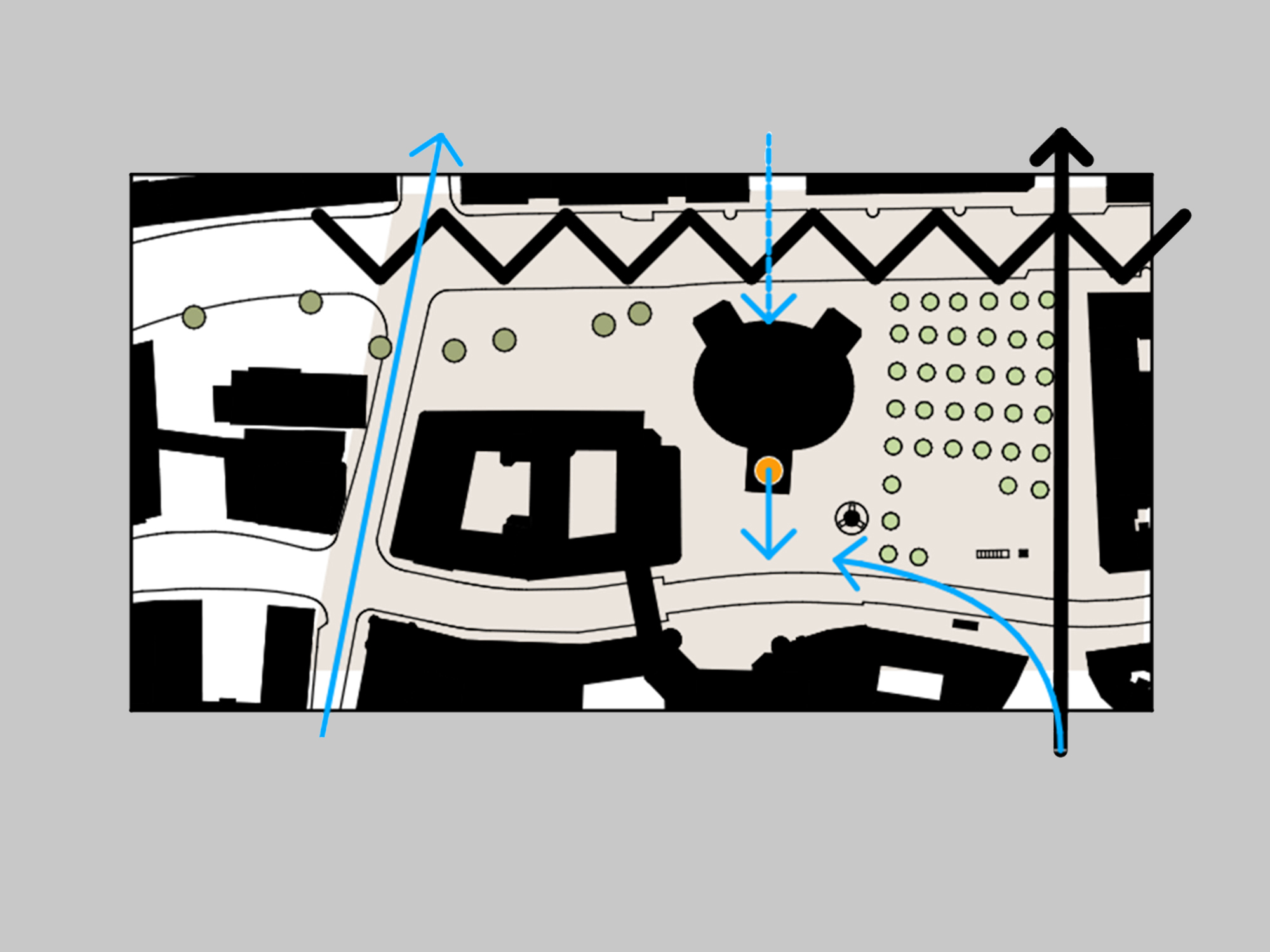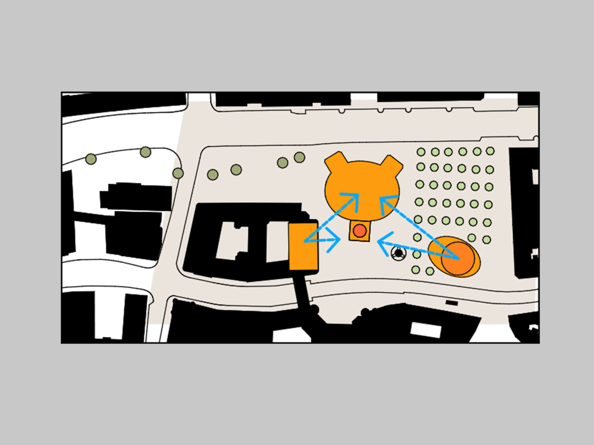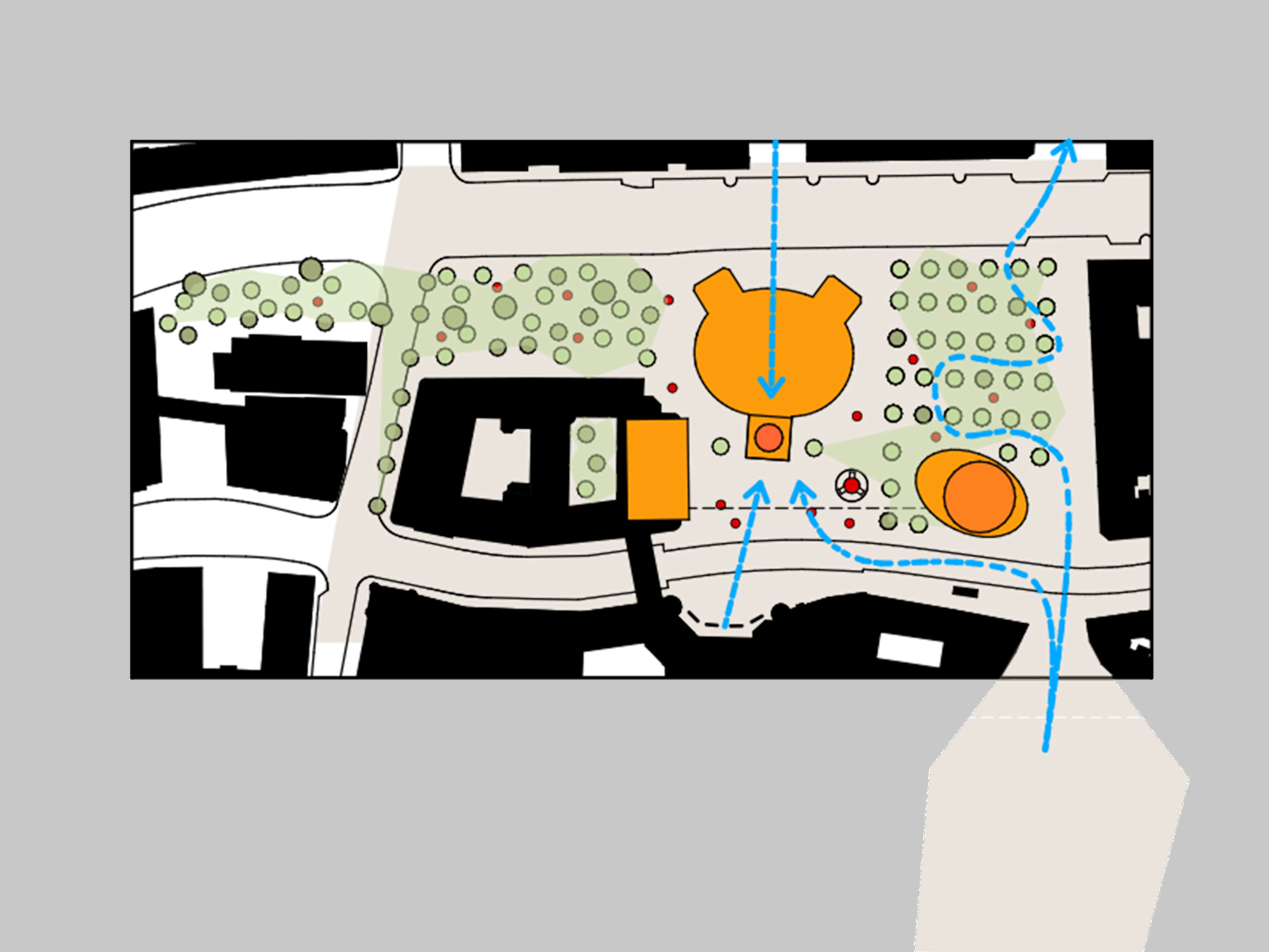 Die Architekturen werden nun über die grünen Bausteine unter Einbindung des bestehenden Baumdaches ganz wesentlich ergänzt und auch erweitert.