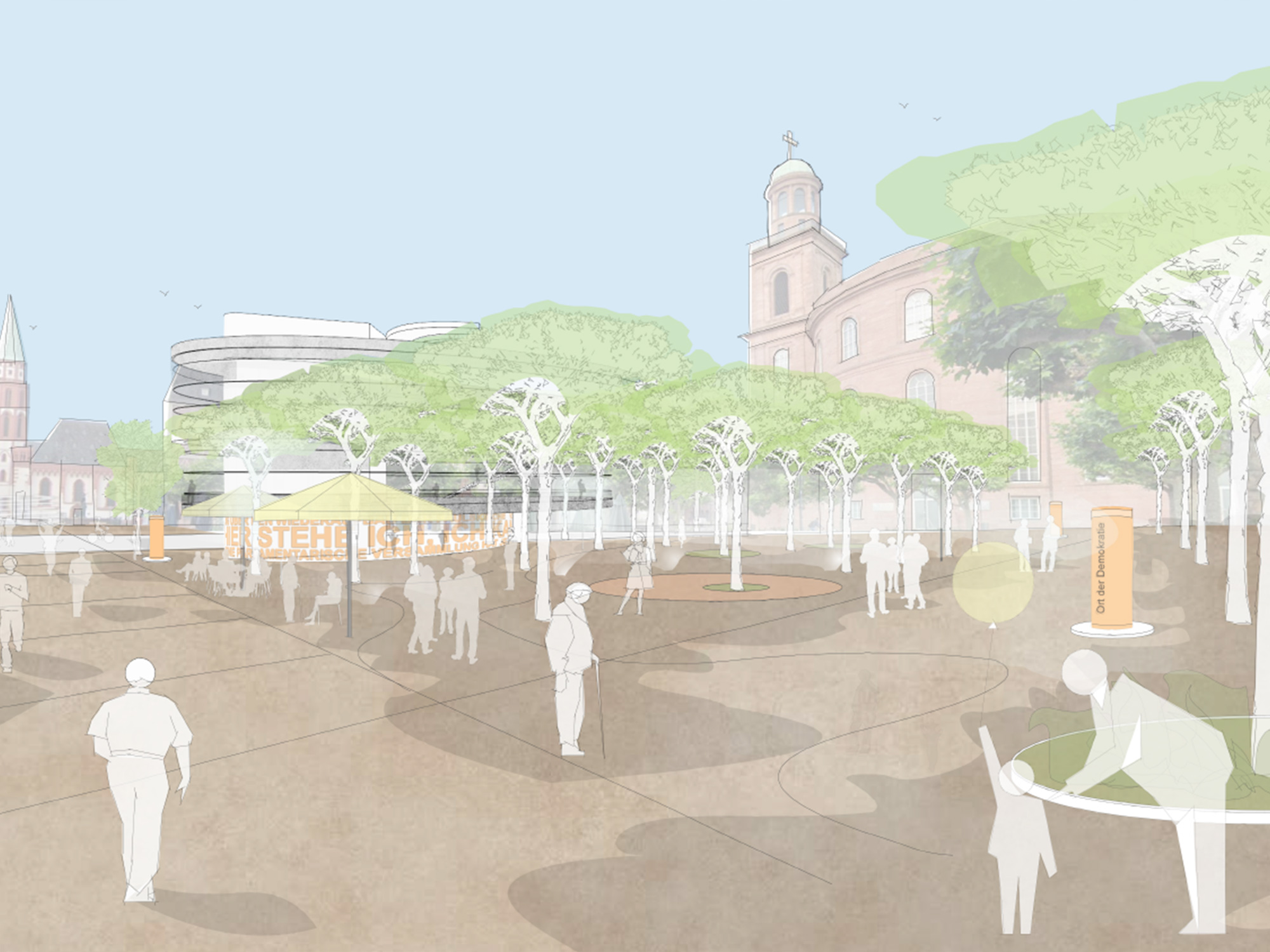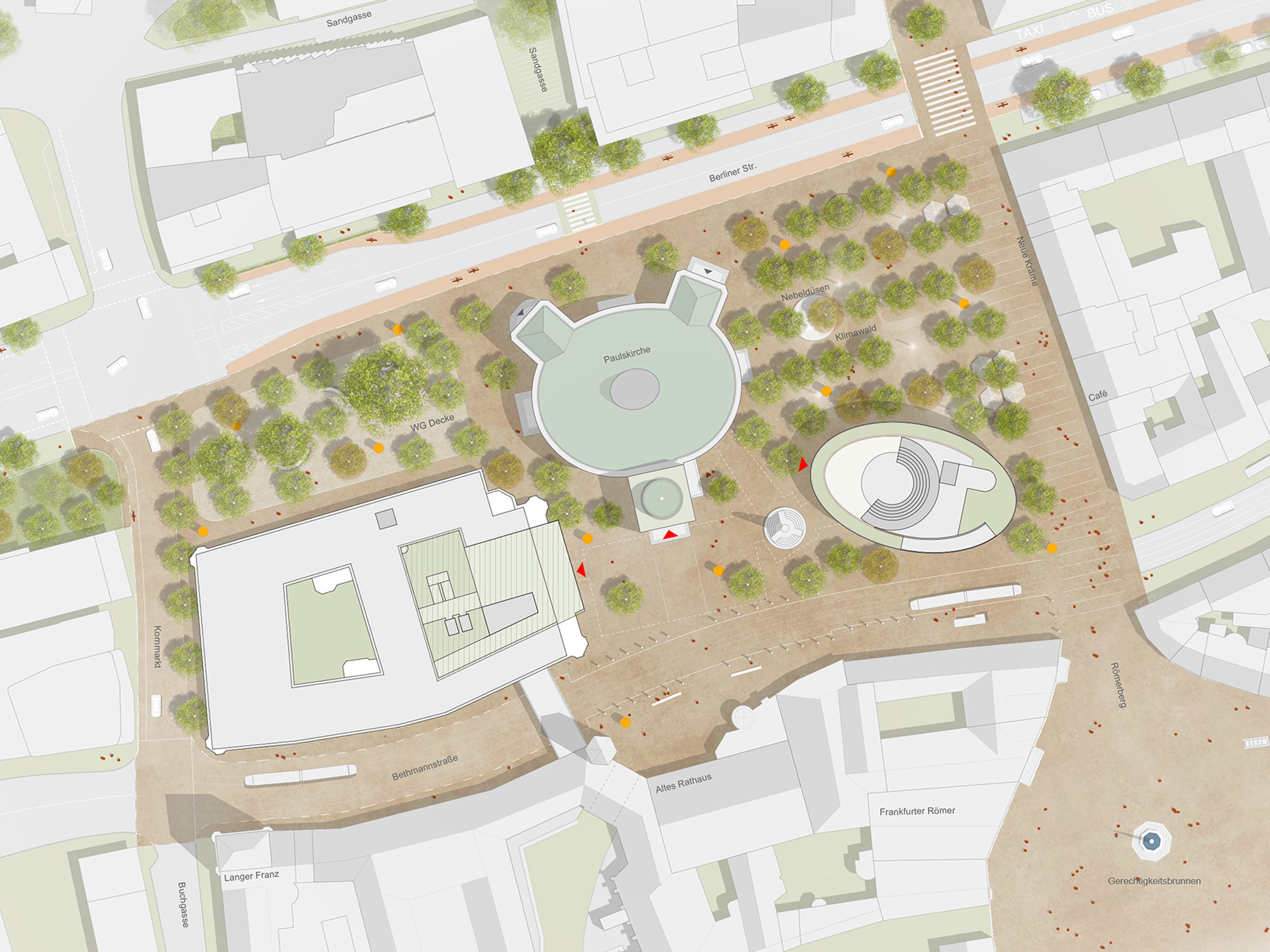 Der steinerne, oft überhitzte Stadtplatz auf dem Römerberg wird ausgeglichen über eine kräftige Ausweitung des Baumbestandes am Ort der Demokratie; allerdings nicht mehr so monochrom über Platanen, sondern über eine Vielfalt neuer Baumstandorte, die eine Vielfarbigkeit, auch im Blüh- und Duftbereich, einbringen und erlebbar machen.