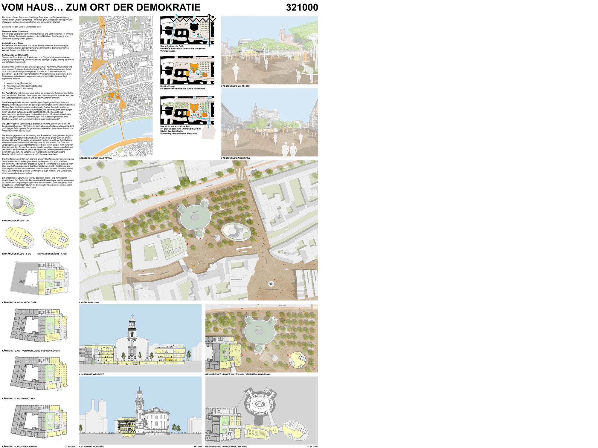 Das Stadtfeld wird durch den Dreiklang aus Alter Kämmerei, Paulskirche und einem neuen Entréegebäude strukturiert. Die Architekturaufgabe wird dabei nicht durch ein Einzelgebäude gelöst, sondern im Zusammenspiel der Baukörper – ein Sinnbild demokratischer Wechselwirkung. Die gewünschten Nutzungsbereiche können organisatorisch und architektonisch wie folgt zugeordnet werden: