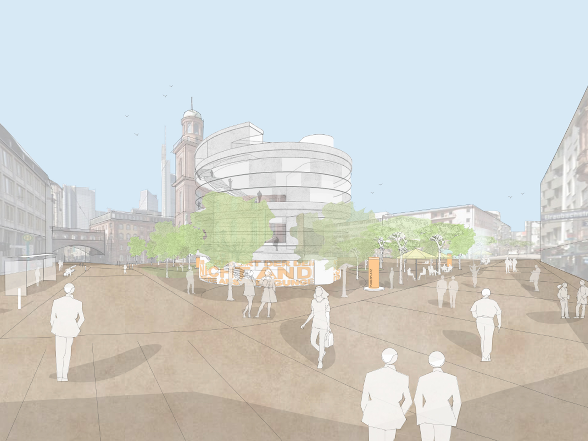 Ein urbanes Stadtfeld zwischen Schaumainkai und Eschenheimer Tor wird als offener Ort der Demokratie gedacht – durch Rückbau, Durchwegung und öffentliche Zugänglichkeit gestärkt.
